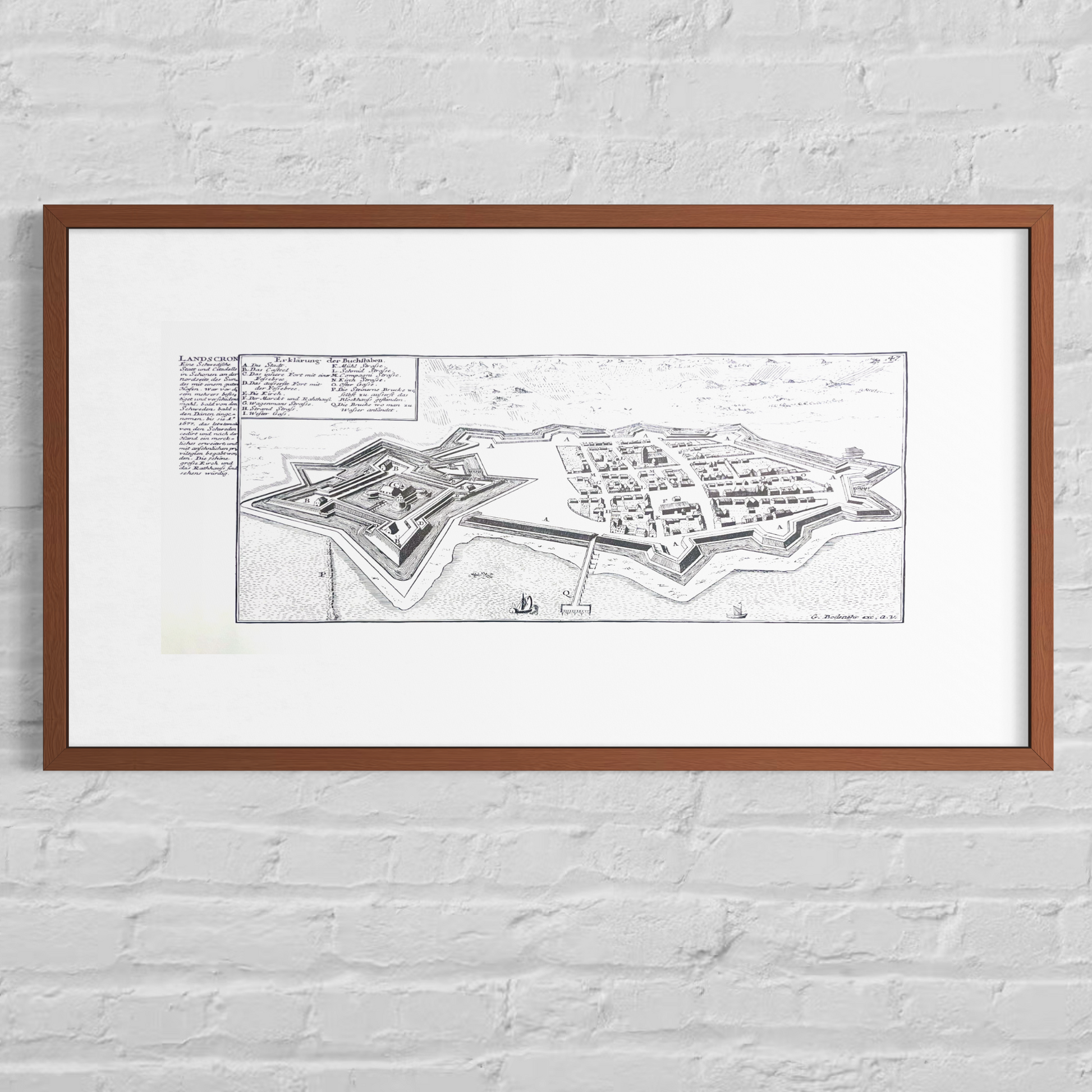 Det här trycket har en del kuriosa kopplat till sig, både vad gäller upphovspersonen och motivet. Det visar sig nämligen att det Landskrona som avbildats inte alls såg ut så när verket gavs ut. Dessutom hade Gabriel Bodenehr lånat själva bilden från den danske kopparstickaren Johan Husman. Den bilden avbildade nämligen Landskrona i samband med den danska erövringen av staden 1676.