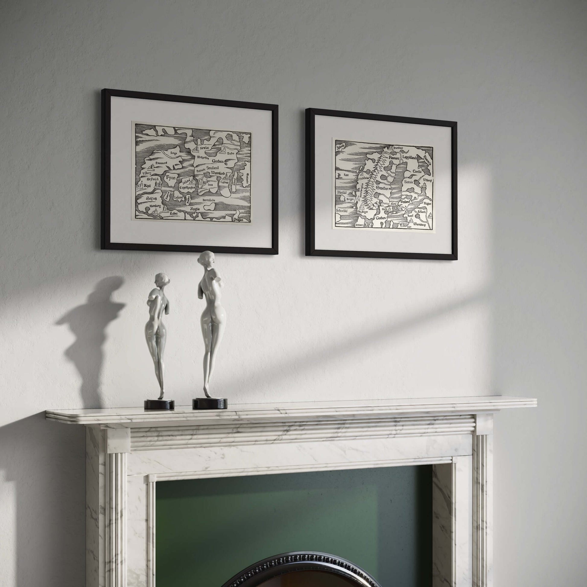 Kartorna är varsamt reproducerade och förstorade från originalverkets träsnitt och är mycket dekorativa. Båda kartorna går att få handkolorerade och en exempelbild från historisk förlaga går att se ovan för exempel.
