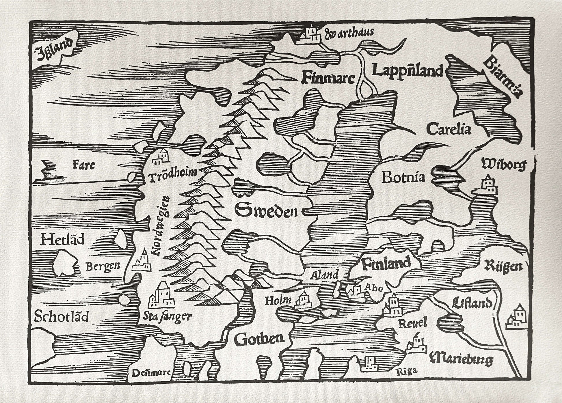 Mapp med två av kartorna från Sebastian Münsters Cosmographia med tillhörande svensk översättning från originalet.