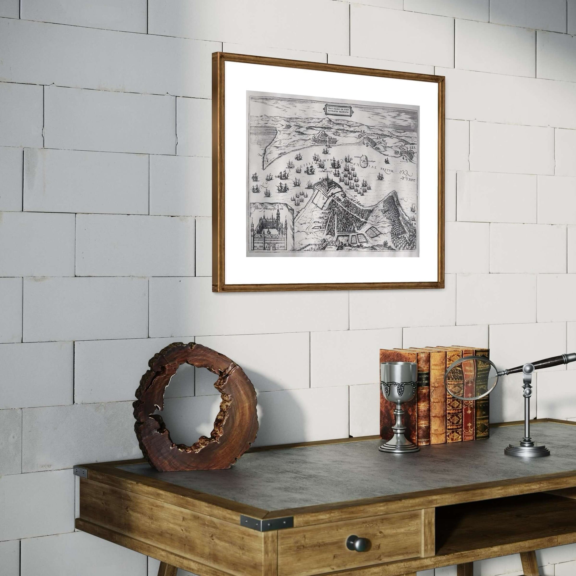 Plansch över Helsingör, Kronborg och Öresund av Georg Braun och Franz Hogenberg. Utgiven i Citiates Orbis Terrarum, band 4, nr 26 - 1588.