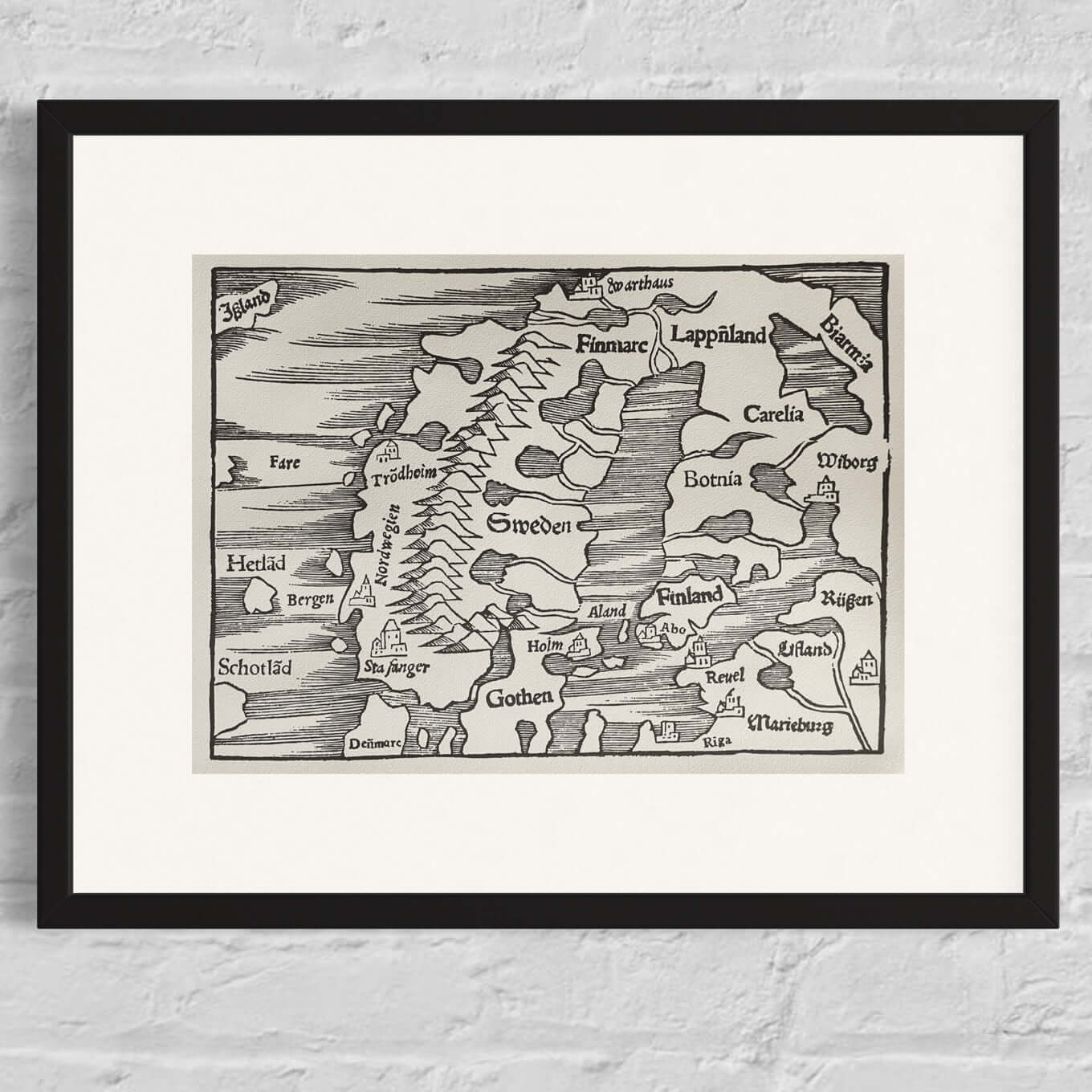 Kartan över skandinavien visar Island, Norge, Sverige, Finland och Danmark samt delar av länderna kring östersjön, såsom baltstaterna och norra Tyskland. Ett uppmärksamt öga kan förstås se de rena felaktigheter och stolleryck som Münster adderat till kartan. Men det blir än tydligare när man tittar på de tillhörande texterna. Med en världsbild tydligt centrerad kring det heliga romerska riket och särskilt tyska som ett slags urspråk förklarar Münster i sitt verk att trots att de norra länderna är kalla, ogästvänliga och med ofruktbara jordar, så har man gett dem vackra namn - som om de vore de bästa länderna i världen. Han går sedan så långt som att påstå att latinets Scondavia kommer sig av tyskans Schönland och att Finland fått sitt namn efter tyskans Fein. Alltså att det är ett vackert land.